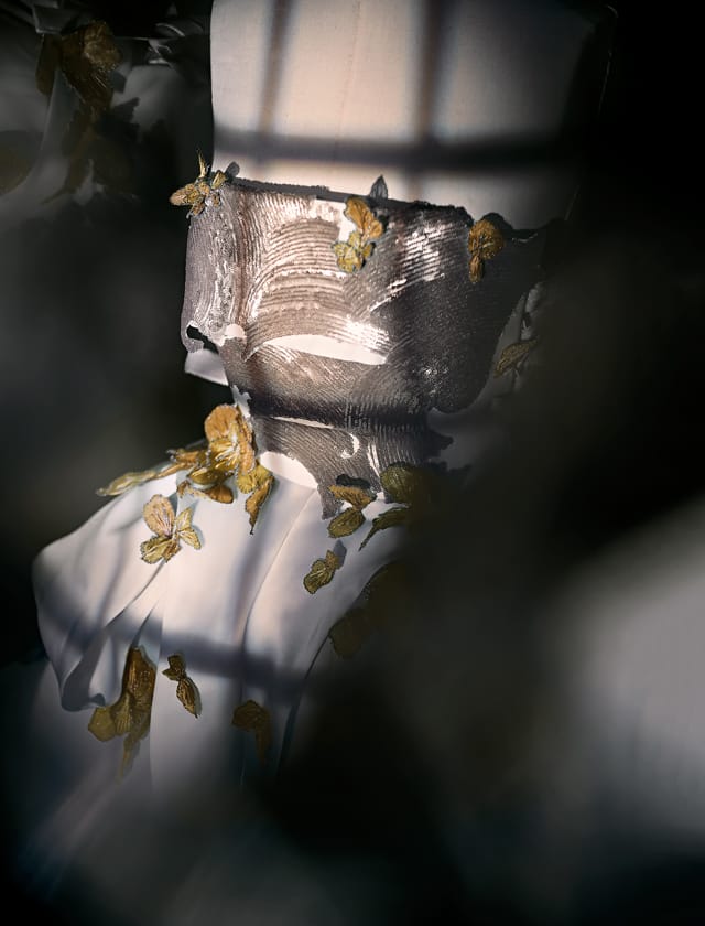 Golden Bridge金桥腕表系列是Corum的标志性杰作,透过澄澈的玻璃表镜,可见加州的经典地标建筑——金门大桥,微缩置身于腕表方寸天地之间,巧妙结合建筑美学和制表工艺。另外还有金桥龙之系列,革命性的直线性机芯置中,手工雕刻而成的金龙雕塑盘绕机芯而上,诠释出金龙的威严神态。Amber Tan追溯宋代美学内蕴,从中得知“点翠”这个古老的工艺。“点翠”是中国传统的贵金属加工技艺,从活的翠鸟身上拔取宝蓝色羽毛,才可保证颜色华美,但是来到宋朝以后,此残忍奢靡的做法遭到宋太祖的大力禁止。“我们认为‘点翠’并不只有一种方式呈现,所以我们巧妙将欧根纱制成金色花瓣,细致点缀于礼服上,创造色彩奇异艳丽的效果。”除此之外,Amber Tan将犹如水墨笔迹状的金色亮片缝在礼服上,隐喻Corum Golden Bridge金龙腕表的鳞片。
