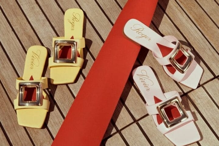 西装外套、条纹上衣和裤子/ Ralph Lauren Purple Label。
