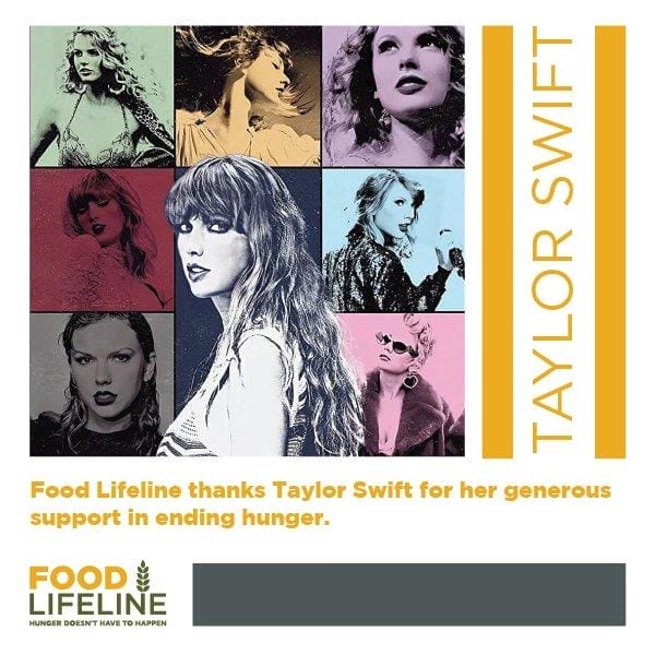 根据 Food Lifeline 的报道,泰勒丝在《The Eras Tour》巡演的每一站都向食物银行捐赠了慷慨的捐款。 7 月下旬在西雅图的演出结束后,Food Lifeline 收到了泰勒丝的捐款,她为华盛顿州西部的 400 多家食物银行提供了数千磅新鲜水果和蔬菜。此外,泰勒丝也对休斯顿食物银行提供了两次捐款,分别是2017年的飓风哈维救援期间以及2023年4月在休斯顿的巡演停留。泰勒丝的慷慨解囊不仅成功帮助到无数的弱势群体,更对饥饿问题带来了迫切性的关注。