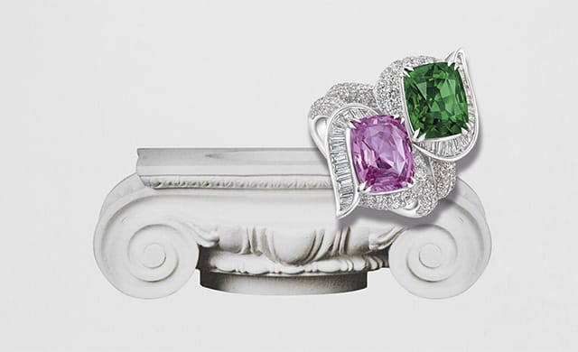 精美Toi Et Moi戒指以钻石、粉红蓝宝石和绿色沙佛莱石点缀,绽放高贵气息/DeGem。