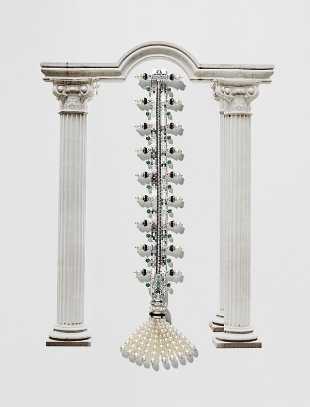 Zip Antique Lampion白金项链,镶嵌祖母绿、缟玛瑙、珍珠和钻石/Van Cleef & Arpels。