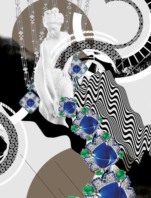 色泽饱满的丹泉石在钻石、蓝宝石与祖母绿的衬托下,让Azure Opulence项链及戒指绽放魅力神采/DeGem。