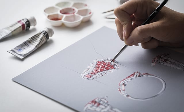 Éventail Souverain手镯以20世纪30年代的Jarretière手镯为设计灵感,延续其源于高级定制时装的不竭灵感。炽热的红宝石细密排列点缀柔美灵动的蝴蝶结之上,椭圆型及枕型切割红宝石共计13颗总重为35.05克拉,以钉镶的方式融为一体,绽放火焰光彩。红宝石圆珠点缀饰钉,玫瑰金和白K金巧妙勾勒,于细节中见证世家对精湛工艺的执着。