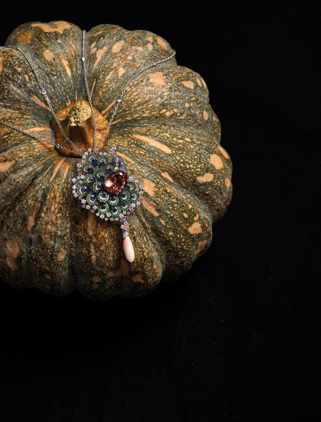以18K白金打造的Oval Tourmaline Gemstone Diamond项链,选用斑斓色调的宝石如电气石、海螺珍珠、蓝宝石、沙佛莱石及钻石,打造栩栩如生的孔雀造型链坠/DeGem。