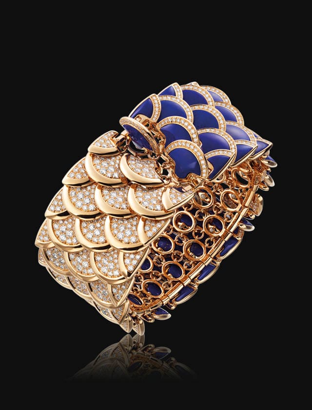 Eurythmis手环,正面为铺镶钻石的连续图案,背面有夜空般深邃的青金石与玫瑰金和钻石相互映衬。只需将手腕轻轻翻转,这枚灵活柔和的手镯瞬时从白昼化为夜晚,从温暖色泽化为沉静暗影。