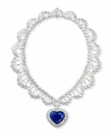 萧邦(Chopard)以这款Red Carpet系列项链,向奥斯卡得奖电影《Titanic》致敬。项链以电影中男女主角的爱情珍宝“海洋之心”为创作灵感,闪烁的钻石项链,中央镶有一颗斯里兰卡皇家蓝宝石(重达60.03克拉),绽放独特光彩。