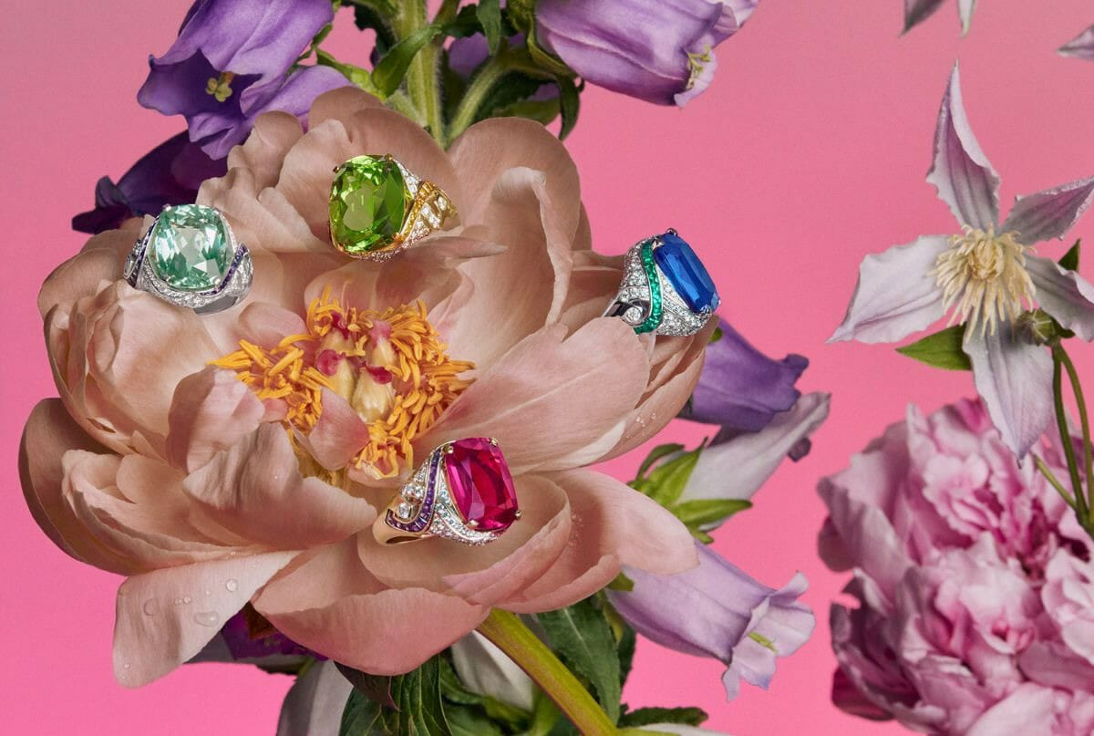 Chopard Red Carpet 2021高级珠宝系列Leaf项链,铂金镶嵌圆形橄榄石(共重37.54克拉)、明亮式切割沙弗莱石(共重27.97)、水滴形切割粉红色蓝宝石(共重23.88克拉)和圆形粉红色蓝宝石(共重5.11克拉)