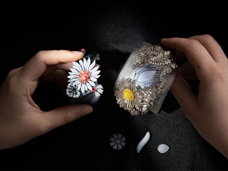 品牌工匠们使用了Fil Couteau技术,让宝石看起来漂浮在空中,这种技术可通过细金线将元素连接在一起,才创造出如此灵活的表链,佩戴时非常舒适。