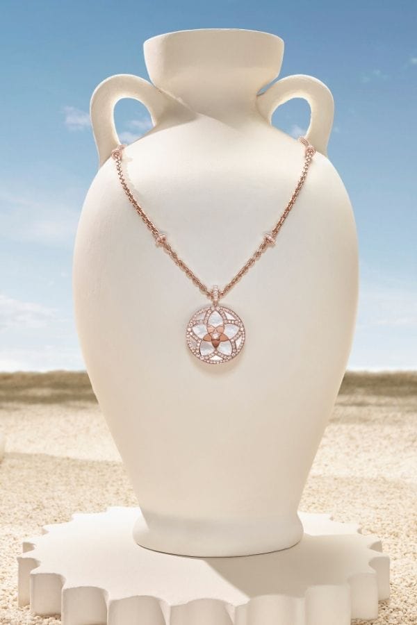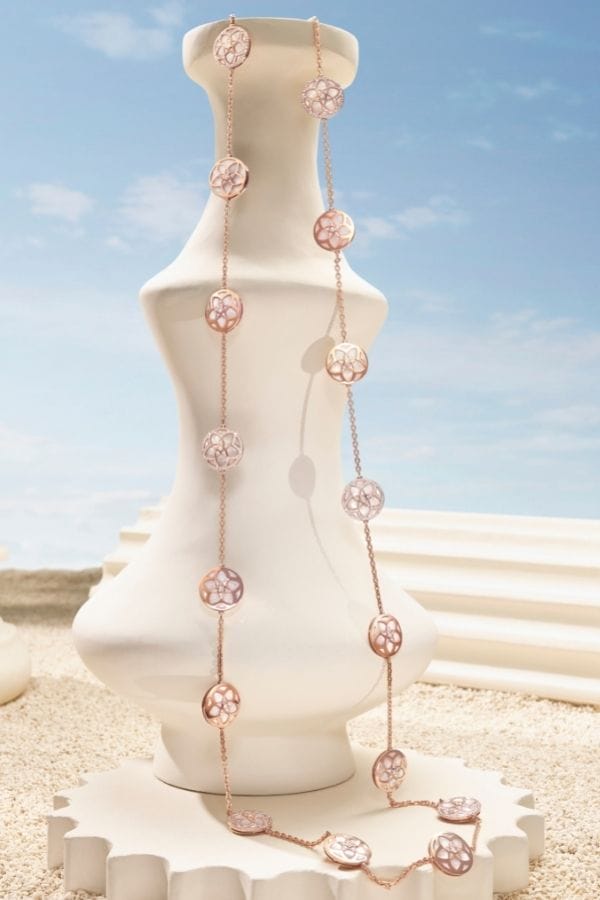 宝格丽Jannah高级珠宝系列采用18K玫瑰金制成,特点在于镶嵌在圆形金框内的“五瓣花”镶有彩虹色的珍珠母贝及闪耀美钻,无论是吊坠项链、饰以金色和钻石流苏的吊坠耳环、耳钉及项链等,其简约、精致及多功能的设计,让女性可自由与任何日常风格穿搭。