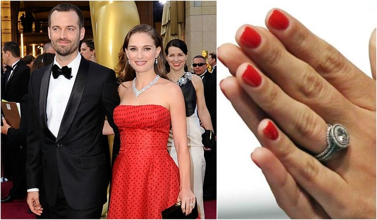 向来热心于环保的Natalie Portman的婚戒由芭蕾舞者转行为设计师Jamie Wolf操刀,采用可循环利用的白金材质结合钻石镶嵌,奢华之余也环保。