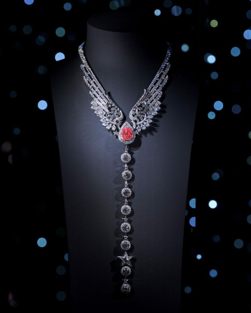 系列中的点睛之作当属 Wings of Chanel 项链,它犹如一双由璀璨钻石打造的羽翼,轻柔环绕颈间。项链中央镶嵌着一颗华美非凡的 19.55 克拉帕帕拉恰蓝宝石,散发出细腻精致的粉橙色调,尽显奢华光芒。其长吊坠更可巧妙拆下,作为手链佩戴,一物多用。