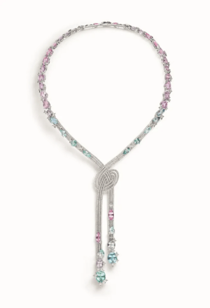 早在19世纪,尚美巴黎(Chaumet)就开始以天空为创作主题,将苍穹转瞬即逝的美态融入珠宝创作中。Les Ciels de Chaumet高级珠宝系列将遥不可及的天穹幻景,凝练为女人手中的瑰宝。仙气柔美的Passages星驰长空白金项链,散发纯净清透的光芒,动人心弦。主角是2颗产自莫桑比克的椭圆形切工帕拉伊巴碧玺,重量分别为5.73克拉左右和5.21克拉左右,配搭42颗产自莫桑比克、总重约63.77克拉的花式切工五彩帕拉伊巴碧玺,以及明亮式切工碎钻,在颈间构成缓缓流动的星光。