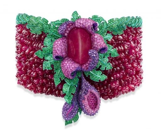 Floral 白金项圈,主石为一颗126.29ct的椭圆形弧面切割红宝石,点缀水滴形切割红宝石、圆形切割沙弗莱石、圆形切割粉色蓝宝石、圆形切割紫水晶和圆形切割红宝石。