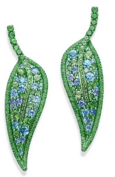 Leaf 钛金属耳坠,镶嵌总重15.36ct的沙弗莱石、总重7.58ct的锆石、总重3.01ct的浅色蓝宝石。