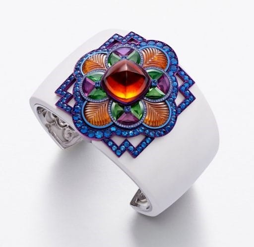 以公平采矿认证的18K白金和钛金属所打造的手镯,镶嵌锰铝榴石、柑橘石榴石、沙弗莱石、青金石、蓝宝石和紫水晶。