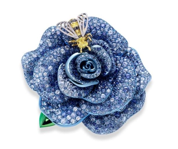 玫瑰花戒指,公平采矿认证的18K金与钛金属镶嵌蓝宝石、艳彩黄钻、白钻和黑钻。