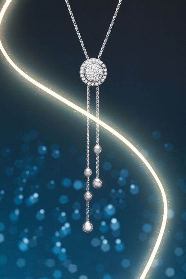 这款Piaget Possession钻石项链低调又闪耀,采用18K白金制成,项链搭配可上下滑动并镶满钻石的圆形吊坠,链条的尾端分别饰有两颗和三颗白金圆珠,共镶嵌55颗明亮式切割美钻(约重0.68克拉),尽显优雅又摩登。