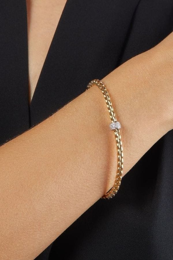 凭借意大利工艺与经典设计风格闻名的FOPE,其Novecento金色网链设计在视觉上看似厚重,但却给予佩戴者轻盈而贴服的舒适感受。这款Flex’it网链设计手镯提供黄金、白金及玫瑰金供选择,并饰有一颗钻石圆环吊坠,精简摩登又出众。
