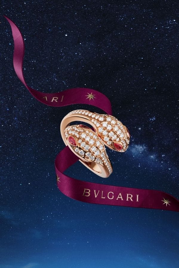 宝格丽(Bvlgari)这款Serpenti Seduttori系列双蛇造型戒指以灵动之美捕捉众人眼球,采用18K玫瑰金材质制成,镶嵌闪耀钻石并运用红碧玺点缀蛇的眼睛,活灵活现,造型立体逼真,让女性举手投足间尽显诱人魅力。