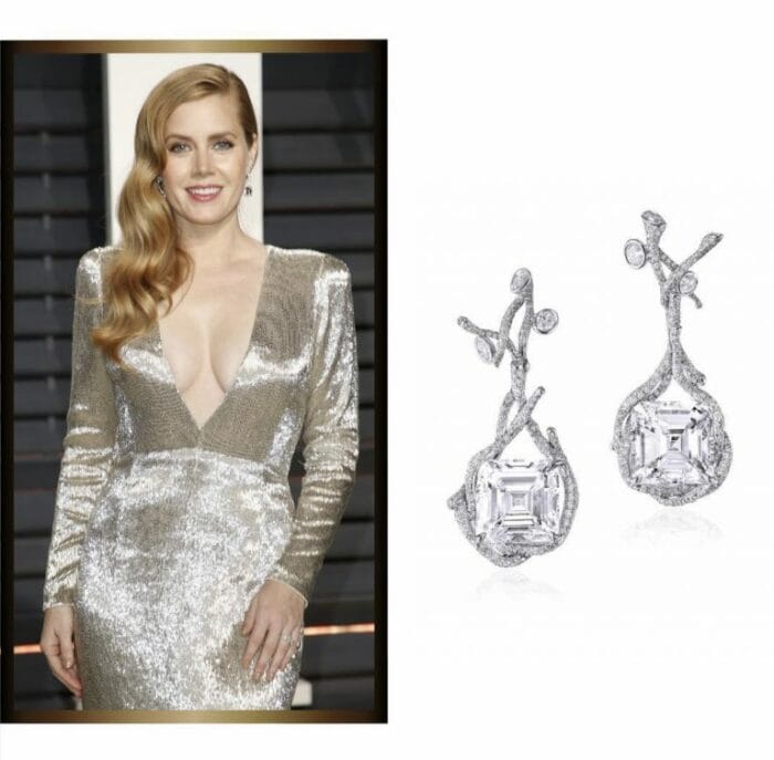 好莱坞甜姐儿艾美亚当斯(Amy Adams)2017年出席奥斯卡颁奖礼,佩戴品牌四季系列的白钻树枝耳环,身穿Tom Ford深V礼服,和谐的金属色调呈现一片波光粼粼,性感又大气。