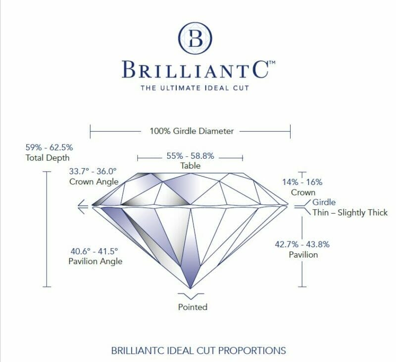 BrilliantC™钻石利用美国宝石协会实验室获得专利的光线追踪测试,分析光彩在每颗 BrilliantC™ 钻石中的折射方式。每颗BrilliantC™钻石皆达到AGS Ideal 0000极致等级,包括切工、光彩、抛光和对称等方面。世界上只有不到0.1%的钻石符合这项评级标准。