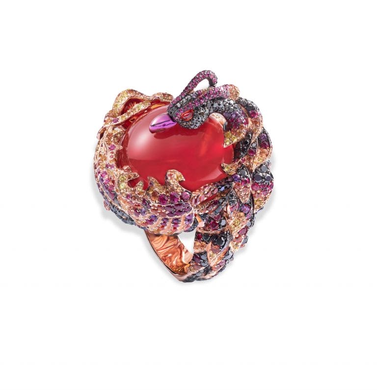 高级珠宝戒指,18K玫瑰金与钛金镶嵌一颗欧泊(43.46克拉)、圆形黄色蓝宝石(3.36克拉)、梨型橙色蓝宝石(2.80克拉)、圆形黑钻(2.55克拉)、圆形红宝石(2.65克拉)、圆形橙色蓝宝石(0.85克拉)、圆形紫水晶(0.58克拉)/Chopard。