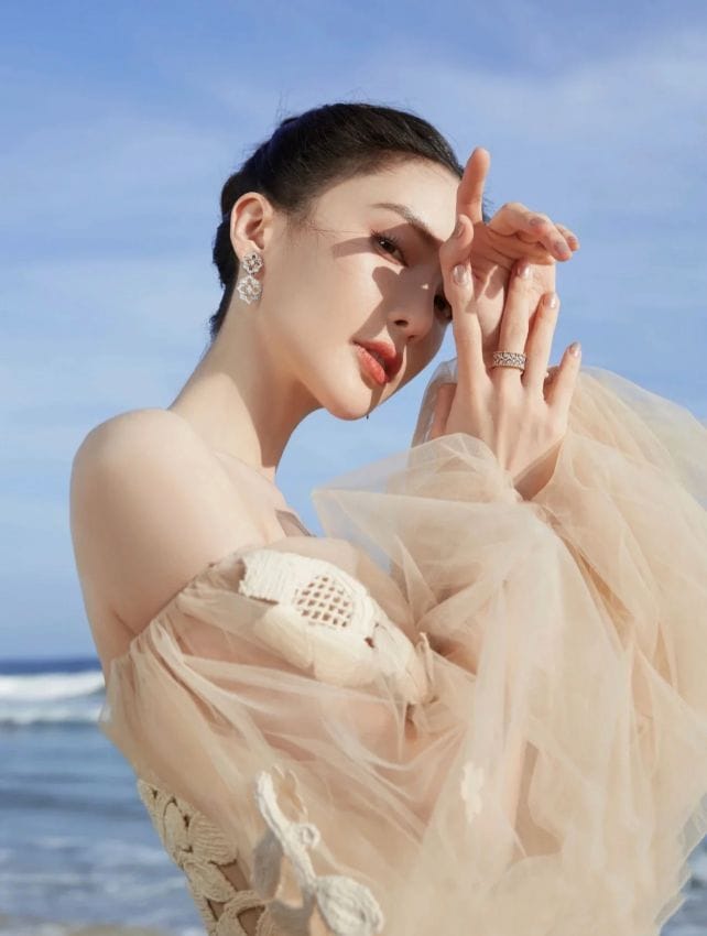 中国女星金晨身穿仙气十足的裸色抹胸礼服,配搭Buccellati Ramage系列叶子造型的戒指和花卉造型的耳饰,白金与钻石组合焕发剔透光芒,不费力地为造型画龙点睛。
