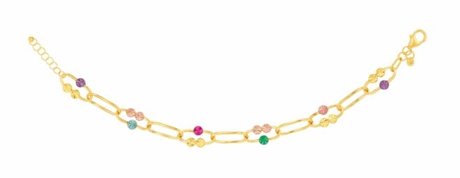 这款多色 Oro Italia 916 手链,象征着团结的力量。手链重约 10 克,既适合日常佩戴,也能在特殊场合中佩戴。手链采用现代电泳漆技术,实现其独特的色彩组合,例如紫色、粉红色和绿色,同时保持了 22K(916)黄金含量的质量而不影响其重量。它象征着马来西亚人民的坚韧与决心,是任何珠宝系列中的意义深远的瑰宝。