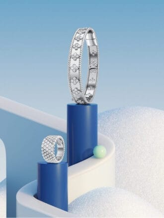 Perlée Clovers 系列作品饰有梵克雅宝(Van Cleef & Arpels)的幸运象征 —— 四叶幸运图案。这款由 18K 白金打造的扣片手镯,中央饰有一颗颗圆珠,镶嵌 72 颗(约 1.61 克拉),释放出最璀璨的光芒。