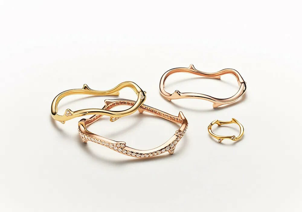 此设计灵感来自迪奥先生的童年回忆,母亲在花园教他修剪玫瑰的技巧,维多利娅从这段往事撷取灵感,构思出独特的珠宝杰作,以精湛工艺、抽象手法演绎玫瑰花茎与荆棘的细节,勾勒出利落简约的线条,打造充满现代气息的珠宝首饰,她如此形容Bois de Rose系列:“玫瑰花茎缠绕着手指,令珠宝散发柔情诗意,就像浪漫的宣告,或永恒爱意的象征。”