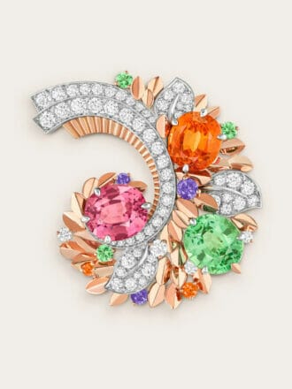 品牌以一款胸针再现葱郁的园林景色,邀请大家漫步于 Ravello 的空中花园。这款 Symphonie Florale 胸针演绎 Amalfi 海滨别墅绿树成荫的氛围,正如中世纪的 Villa Rufolo 重现眼前。这款胸针的色调和谐,采用白 K 金和玫瑰金打造,镶嵌一颗 8.10 克拉的椭圆形切割锰铝石榴石,一颗 7.01 克拉的椭圆形切割沙弗莱石榴石,一颗 7.31 克拉的椭圆形切割粉红色石榴石,如沐浴在阳光下的水果般光彩绽放。