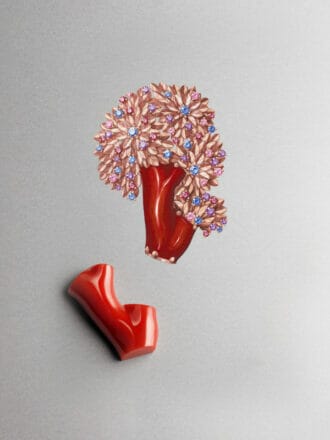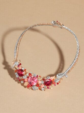 项链中央以圆模雕刻玫瑰金、白 K 金及钻石再现枝繁叶茂的意象,与红色或天使肌珊瑚组成一个个瑰丽的 “鸟巢” ,呵护着三颗色彩缤纷的宝石,包括中央的粉红色枕形切割红碧玺重达 24.02 克拉,两旁点缀的椭圆形切割红碧玺分别重达 12.44 及 11.52 克拉,柔和的粉色调流露出宝石的剔透光彩,绽放熠熠光芒。