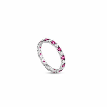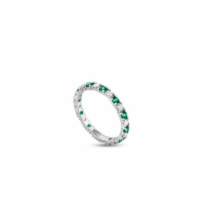 炫目华丽的宝石与美钻优雅搭配,营造闪闪发光的亮点,单独佩戴彰显极简主义,叠着佩戴夺目耀眼,尽显精致典雅。每一枚戒指都镶嵌不同数量的宝石,蓝宝石永恒戒指上镶嵌了14颗蓝宝石(0.78克拉)及14颗闪亮钻石;红宝石永恒戒指则拥有13 颗红宝石(0.79 克拉)和12 颗钻石;至于祖母绿永恒戒指则以12 颗祖母绿( 0.58 克拉)和 12颗钻石镶嵌而成。