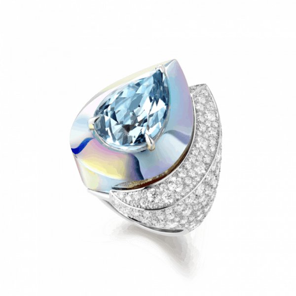 Laser高级珠宝戒指,白金镶嵌1颗11.88克拉的梨形切割海蓝宝及全息陶瓷,铺镶钻石/Boucheron。