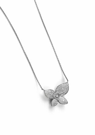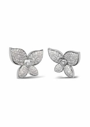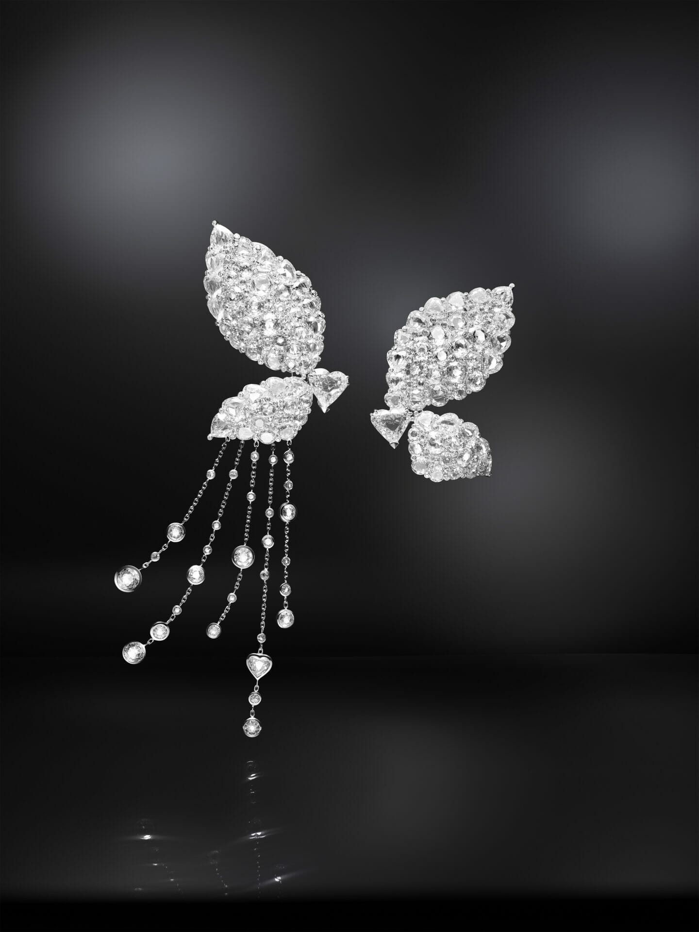 每款珠宝的蝶翼由符合Chopard可持续发展和社会责任理念的“公平采矿”认证18K白金制成,透过精湛工艺,将蝶翼柔滑如丝的质感与钻石的璀璨光芒巧妙融合。