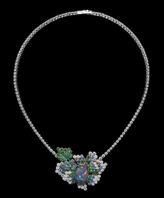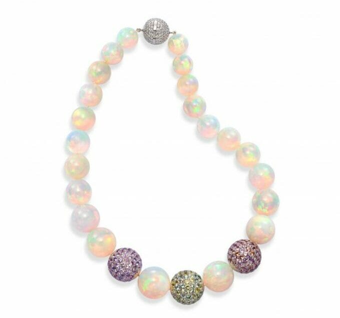 18K白金镶嵌22颗白欧泊圆珠(总重406.10克拉)、明亮式切割彩色蓝宝石(总重42.99克拉)和明亮式切割钻石。