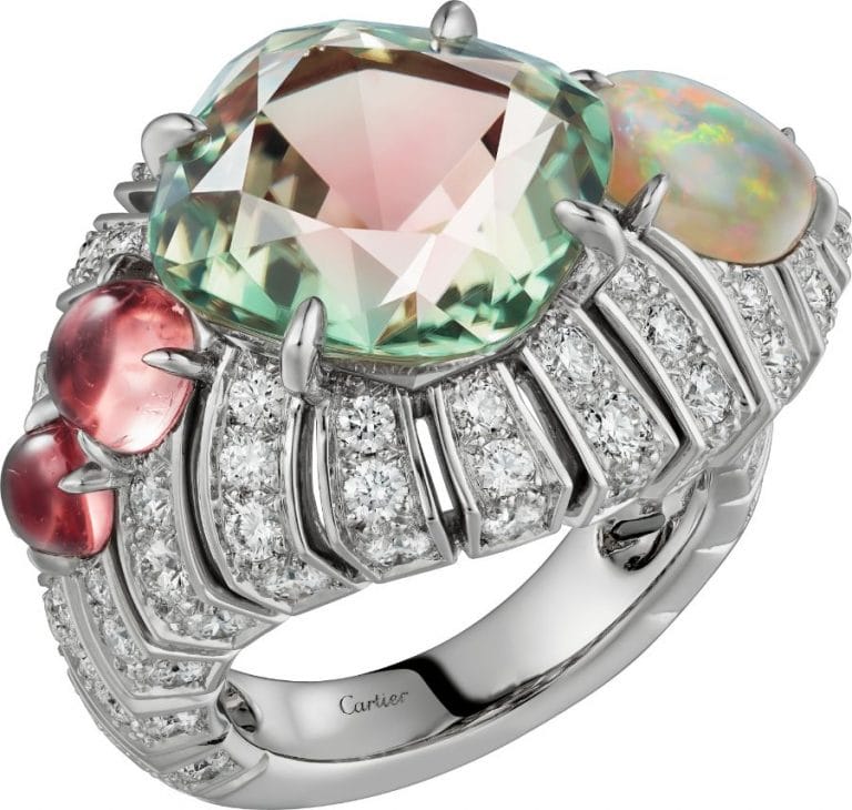 铂金镶嵌碧玺、紫水晶、缟玛瑙和钻石。