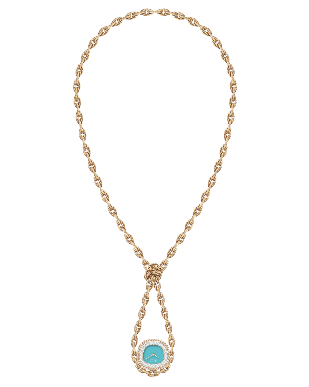 伯爵将先锋制表与色彩美学延伸至全新 Sixtie Swinging Sautoir,灵感源自品牌设计师昔日随性绘于时尚杂志的草图,梯形绿松石表盘环绕钻石镶嵌的手工扭纹金饰,宛如水波轻漾。随光摆动的钻石与金质流苏,让作品更添灵动韵律。另一款传奇 Swinging Sautoir 以扭纹金绳环抱绿松石表盘,仿若随意打结,却凝聚极致工艺,再度模糊珠宝与时计的界线,诠释 “腕表如艺术、佩戴如饰” 的伯爵理念。