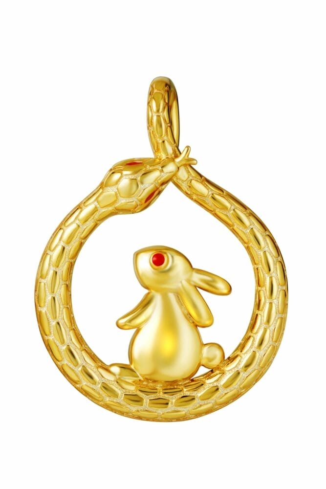 (左起)蛇来运转吊坠、 享福不尽戒指、财富迭起吊坠、四海财源滚滚来戒指。