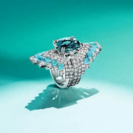 和所有高级珠宝系列一样,挑选完美的宝石进行设计是一个巨大的挑战。这个系列中使用了尖晶石、红宝石、碧玺、黑欧泊和哥伦比亚祖母绿等美丽宝石,难度在于如何凸显它们的天然美感,并且无缝融入设计。此外,我们还在创新和技术上取得了突破。为了实现 “异域与欢乐” 的主题色彩,我们开发了新材料 “蔚蓝欧泊”,由白欧泊和绿松石双层构成。在制作过程中,需要将薄薄的白欧泊精细地叠加在绿松石上,这一过程非常复杂且易碎,但它创造出了色彩鲜艳、独具特色的宝石。这也是整个系列中最具挑战性但最令人满意的部分之一。