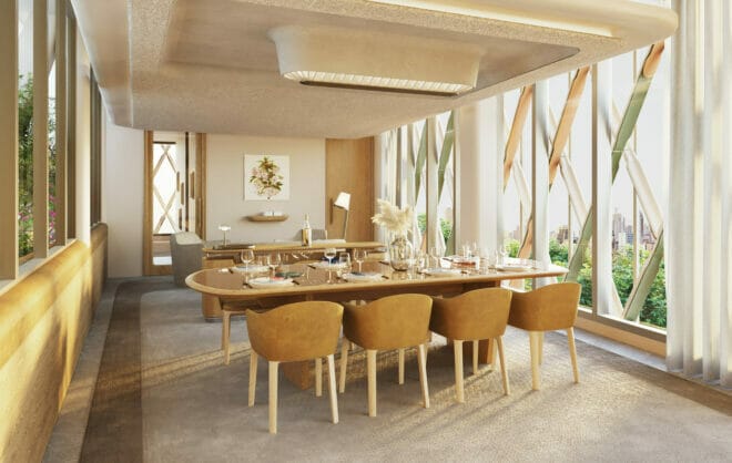 仔细一看,墙壁和天花板采用韩国历史悠久的韩纸,这是一种严格的手工纸艺术,因其精致的纹理效果而显得独一无二。另外,私人沙龙设有舒适的休息区和最多可容纳8位客人的餐桌,透过四面的凸窗还可欣赏城市全景。