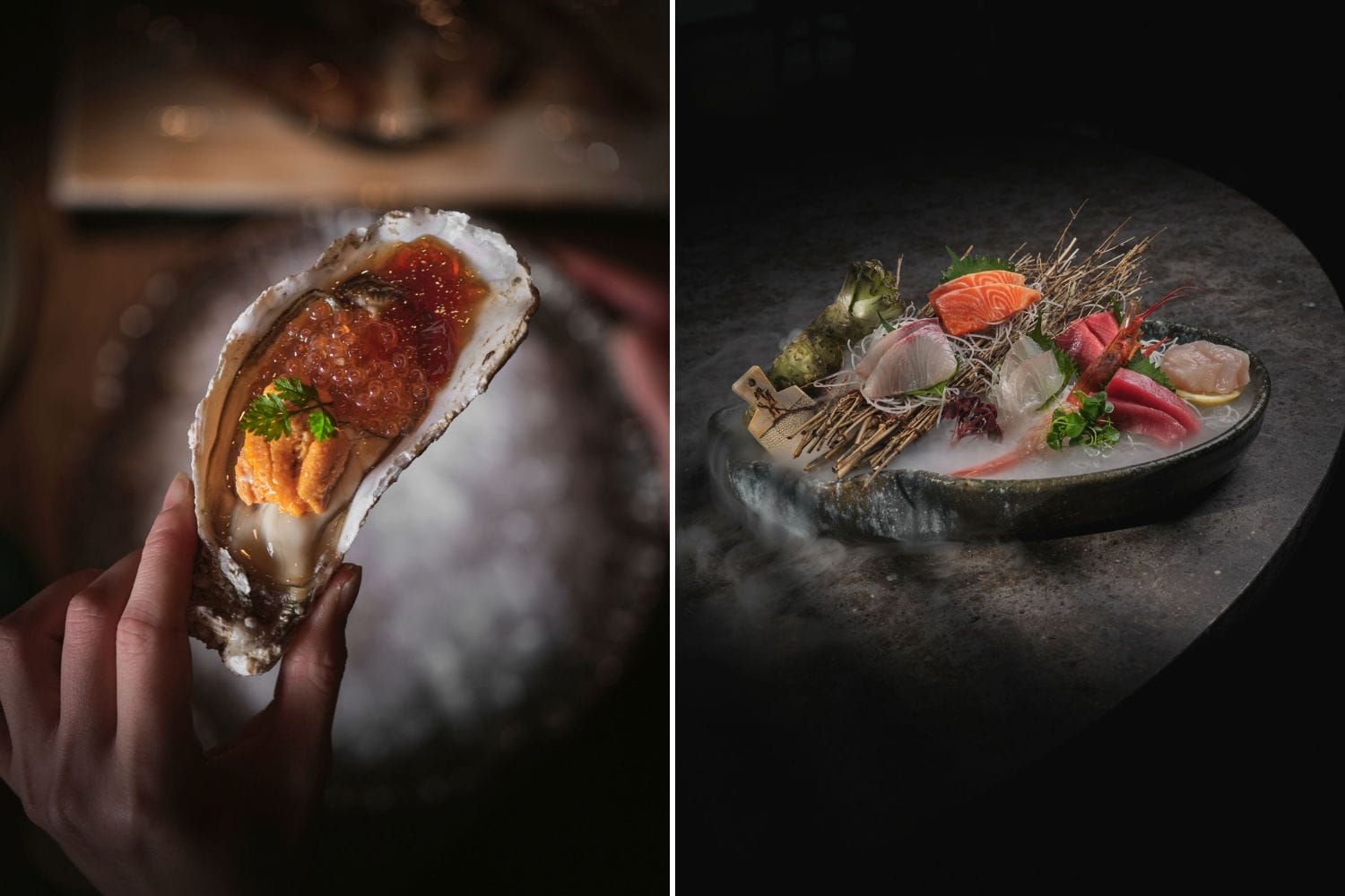 (左)海胆鲑鱼籽生蚝(Kaki no uni ikura nose)、七点刺身拼盘(Sashimi Nanaten Mori)。