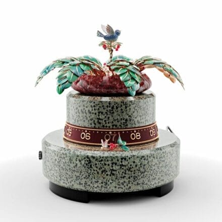 梵克雅宝 (Van Cleef & Arpels) 以创作“诗意复杂功能”闻名,每年推出的自动机械装置座钟,都会成为整个“钟表与奇迹”表展的最大视觉焦点之一。此次呈献的 Apparition des Baies “绿野秘境”自动机械装置,呈现玫瑰金叶片开合的过程。当叶片徐徐绽放后,玫瑰花苞吐蕊,隐藏其中的用白K金制成的小鸟儿振翅欲飞,栩栩如生。这只小鸟周身镶嵌满钻石和蓝宝石。梵克雅宝工坊特别为这件臻品研发一套全新的旋转系统,操控绿穹的开合,与 François Junod 设计的机械装置相配得宜。装置由112块交叠的叶片组成,层次丰富而细腻。此外,这台机械装置的底部由两块达尔马提亚碧玉,以及一个由稀有粉红色锰黝帘石制成的石盆组成。这些石材由梵克雅宝的宝石学专家挑选后,再由工匠细心切割和抛光。