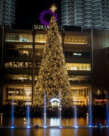 吉隆坡Suria KLCC Suria KLCC 在今年的圣诞节摆放了一座高达32米的圣诞树,这是马来西亚最高的圣诞树!