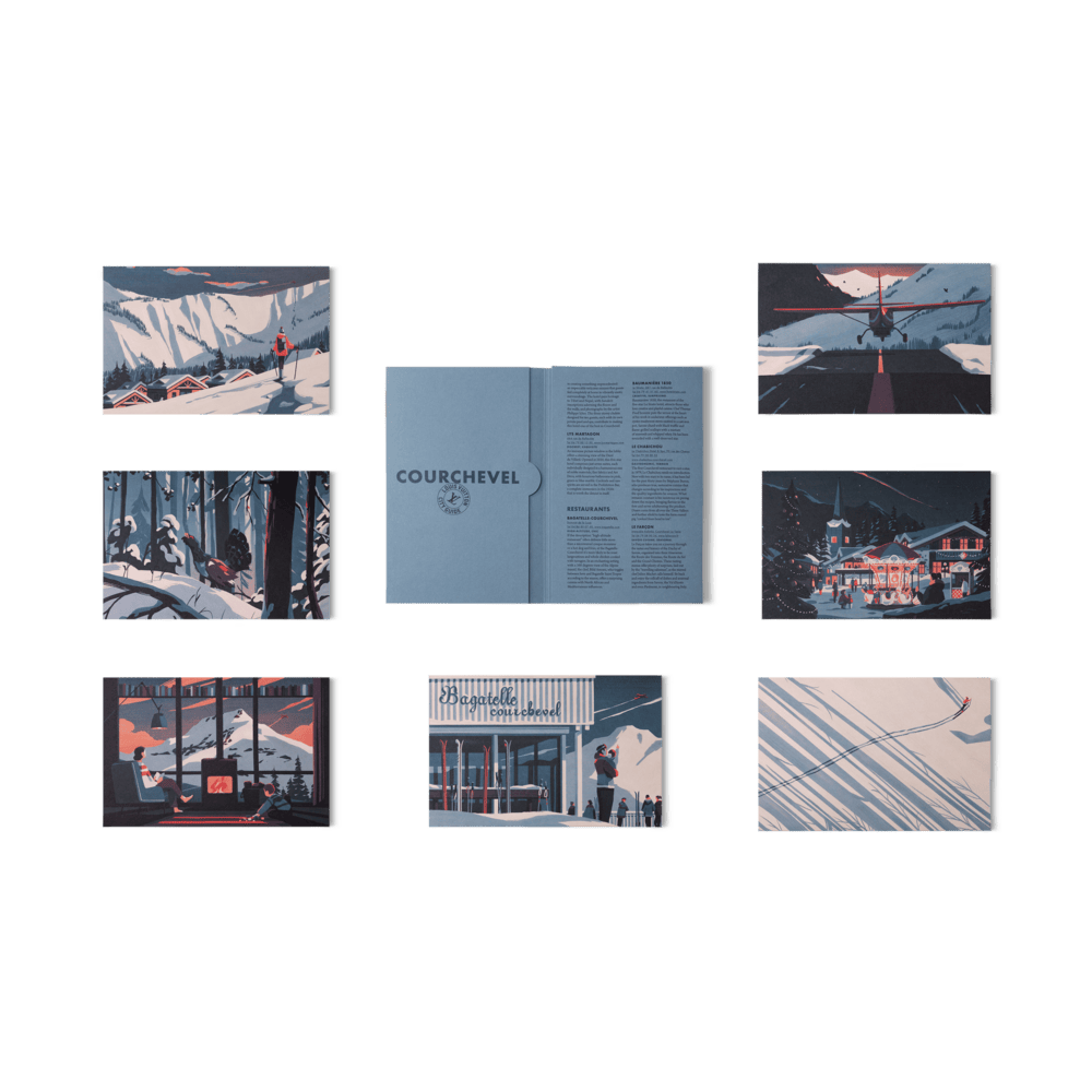 为了让整个系列更显丰富,Louis Vuitton 邀请了一众插画师携手合作,让 Tom Haugomat、Sarah Mazzetti、Jochen Gerner、Simon Bailly、Lisa Mouchet、Giacomo Nanni 和 Fanny Blanc 分别展示他们对滑雪度假胜地的独特视角。从梦幻雪景、基茨比厄尔的中世纪街道到科尔蒂纳丹佩佐到“甜蜜生活”,这些城市的各种面向都被插画家们记录在这些明信片上,让收到这个套装的幸运儿也能够身临其境。