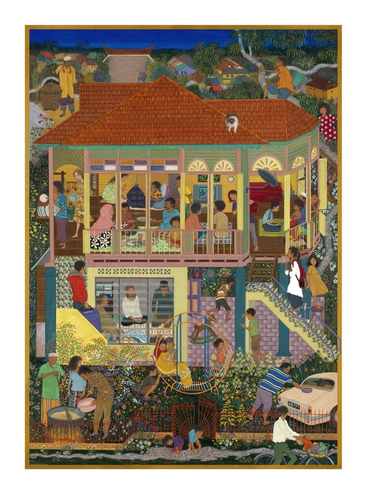 其中的《Progress of Love》尤为动人。艺术家以一张圆形秋千椅为视觉焦点,按逆时针方向围绕的是一个家族从年幼到年长的成员——从孩童、青年到父母、长辈,依序呈现出生命的流转与世代延续。这近乎四代同堂的场景令人倍感亲切,作品不仅描绘了家庭关系的深厚连结,也映照出甘榜峇鲁作为许多人故乡的面貌——一种平凡却踏实的幸福生活。