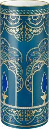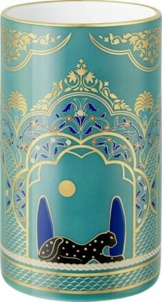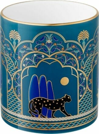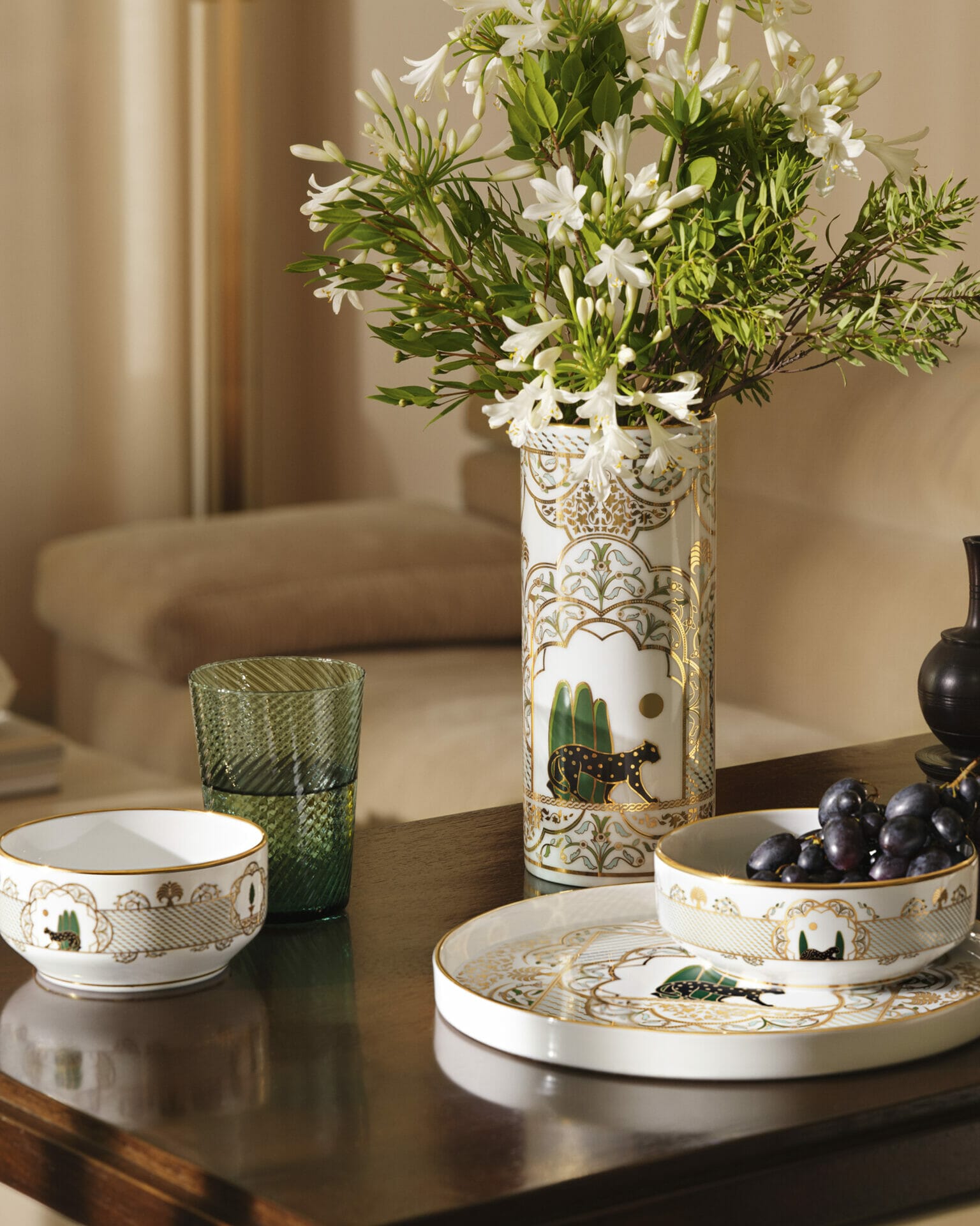 黑色猎豹在柏树间悠然踱步,散发迷人魅力。这正是Cartier生活与餐桌艺术系列的核心主题。此系列作品采用白色陶瓷精制,缀以“孔雀图案”或金色饰纹;蓝色与绿色是Cartier的标志性色彩搭配,那是深受伊斯兰文化美学影响,优雅精致。