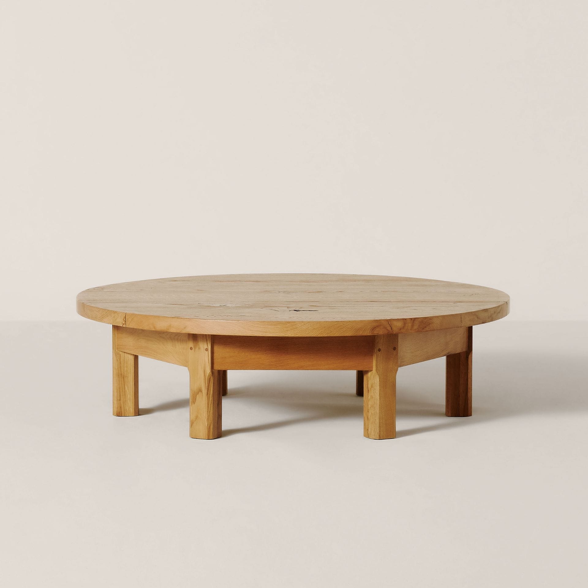 手工挑选的橡木 Canyon Road 咖啡桌配有圆形桌面,采用裸露的钉接工艺和精致的倒角,呈现精致的乡村美感。光滑的打蜡饰面突出了橡木的天然纹理和深度,营造出柔和的光泽。