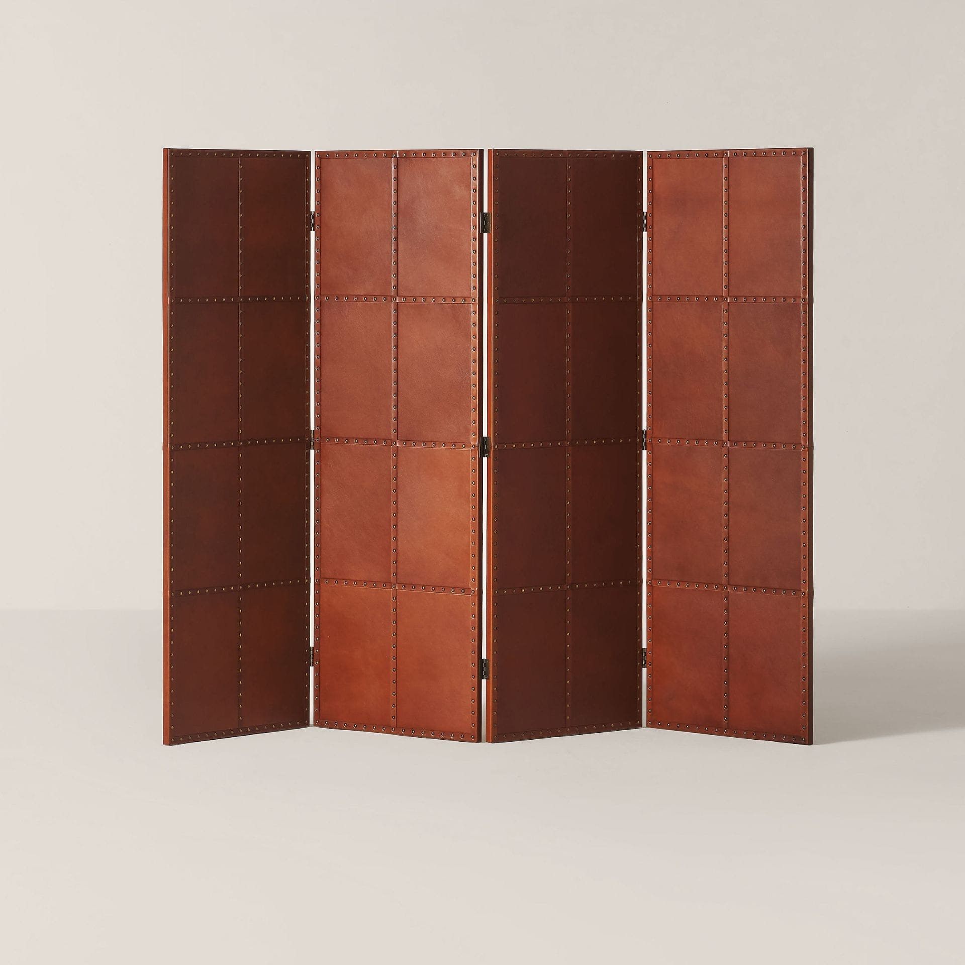 优雅的 Glenwood 屏风采用双面四面板设计,以丰富的棕色皮革软包,并配有铜绿黄铜钉头点缀和饰边。