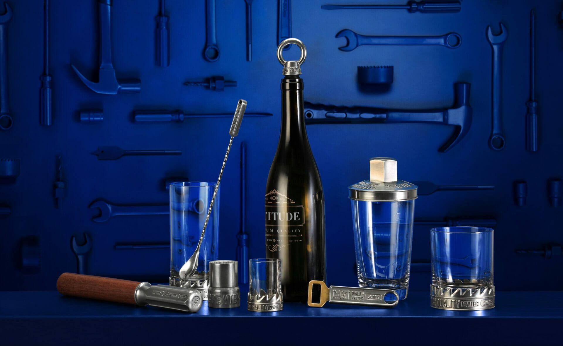 此系列的设计灵感来自五金配件,包括一口杯、威士忌酒杯、高球杯、量酒器、瓶塞、开瓶器、鸡尾酒摇杯、捣棒,让你在家也能体验调酒的乐趣。